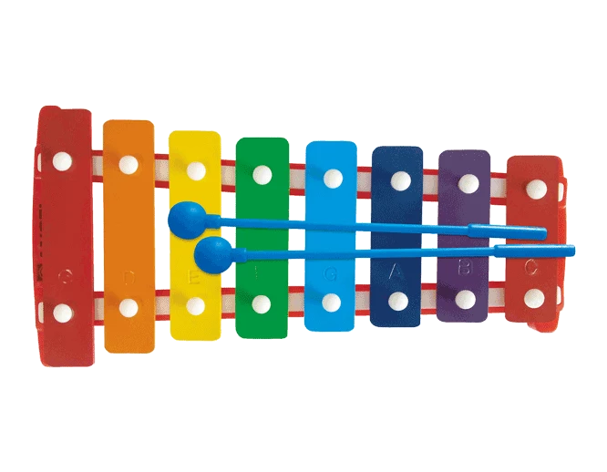 One octave children’s glockenspiel with two beaters. Tuned bars have rounded edges for safety.