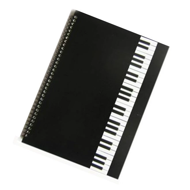 Music manuscript book with 13 staves on each page. Piano Keys design.
