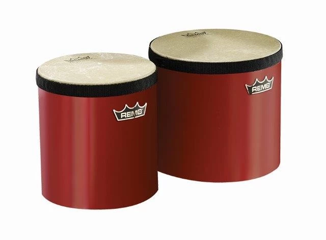 REMO Originals- 6″ and 7″ with pre-tuned Remo Fiberskyn heads. 5″ high. Acousticon shells. Deep red and black colour