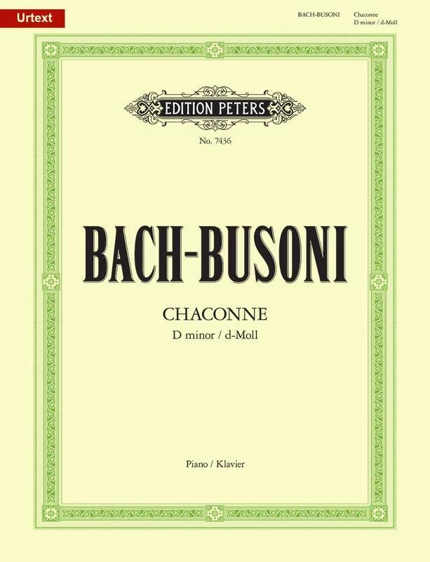 Johann Sebastian Bach’s Chaconne in D minor from Bach’s Partita No. 2 for Solo Violin, transcribed by Ferruccio Busoni for Solo Piano. With Variations from Partita No.2 for Violin Solo. Baroque. Single piece. With introductory text, critical commentary, fingerings and editorial commentary. 35 pages. Edition Peters #EP7436. Published by Edition Peters (PE.EP7436).