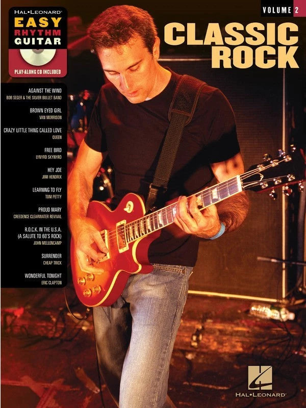 The songs in the Hal Leonard Easy Rhythm Guitar books are presented withlarge, easy-to-read “Rhythm Tab” notation. The rhythm guita r part, or accompaniment, is carefully arranged for beginner to intermediate players. Chord frames are provided to help the player with left-hand fingerings. Lyrics and a melody cue are also included. Just listen to the CD to hear how the guitar should sound, and then play along using the separate backing tracks. The audio CD works on any CD player. For PC and MAC users, the CD is enhanced so you can adjust the recording to any tempo without changing pitch! This pack lets you play the chords and riffs of 10 classic rock songs.