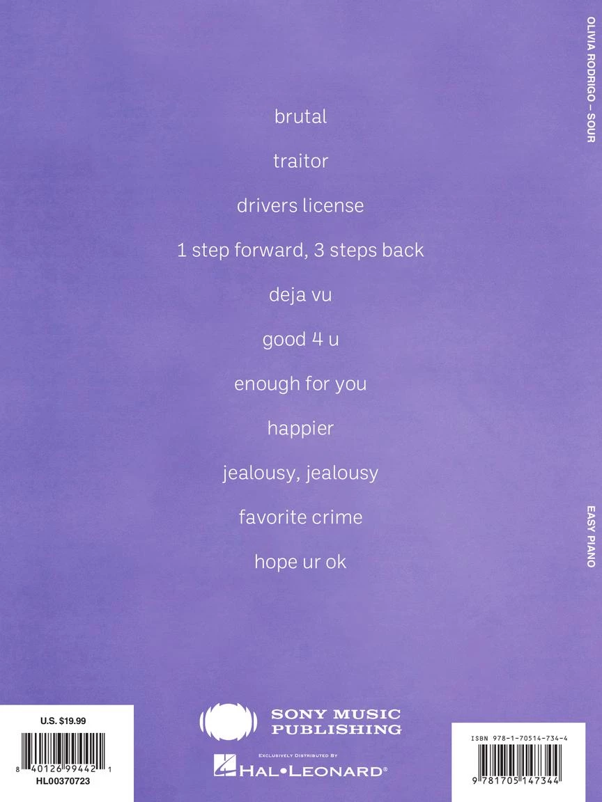 11 songs from the 2021 debut album by Disney Channel starlet Olivia Rodrigo, in arrangements for easy piano. Our folio includes her smash hit single “Drivers License” plus: Brutal • Deja Vu • Enough for You • Good 4 U • Happier • Hope Ur OK • Jealousy, Jealousy • Traitor • and more. PARENTAL ADVISORY FOR EXPLICIT CONTENT.